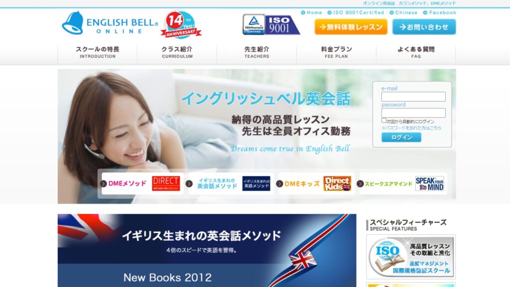 | イングリッシュベルとは | イングリッシュベルはISO9001取得のオンライン英会話スクールです。カランメソッドのほかDMEメソッドのレッスンも受けられます。未消化レッスンはくり越しが可能など続けやすい環境・システムが魅力的です。購入した回数分のレッスンで、カラン以外の他のレッスンも受けられます。 |